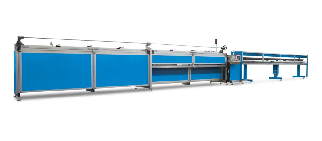 Guillotine cutting lines are designed for producing custom-sized tubes with the internal diameter calibrated at both ends and customized lengths. This type of system is primarily selected for medium to large-scale production, ensuring rapid cutting diameter changeovers. The subsequent punching operation, used to eliminate the “heart-shaped” distortion caused by the cut, can be performed manually via a punching gun or automatically with a punching transfer system downstream of the tube cutting.