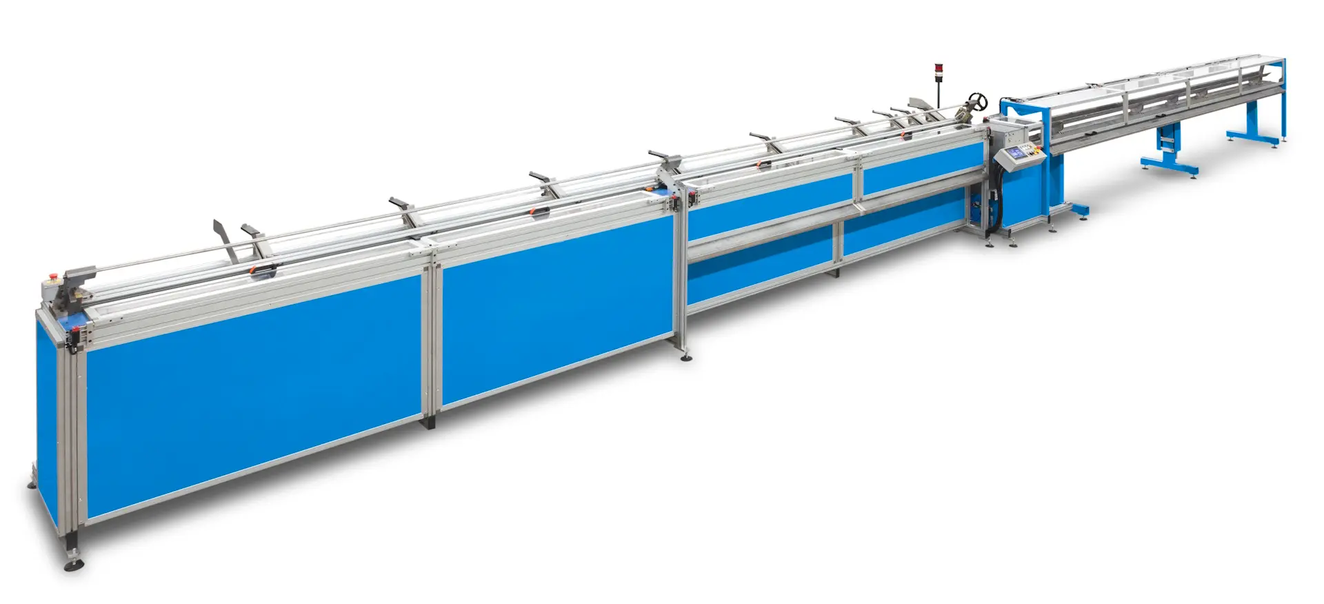The cutting line uses a controlled-axis pusher to ensure high-precision tube advancement and consistent cutting accuracy. With optimized nesting functions, the system significantly reduces waste by maximizing material usage—allowing up to three different cut lengths to be produced from a single bar with virtually zero scrap. The dual-unloading system automatically separates finished pieces, streamlining downstream handling and logistics.