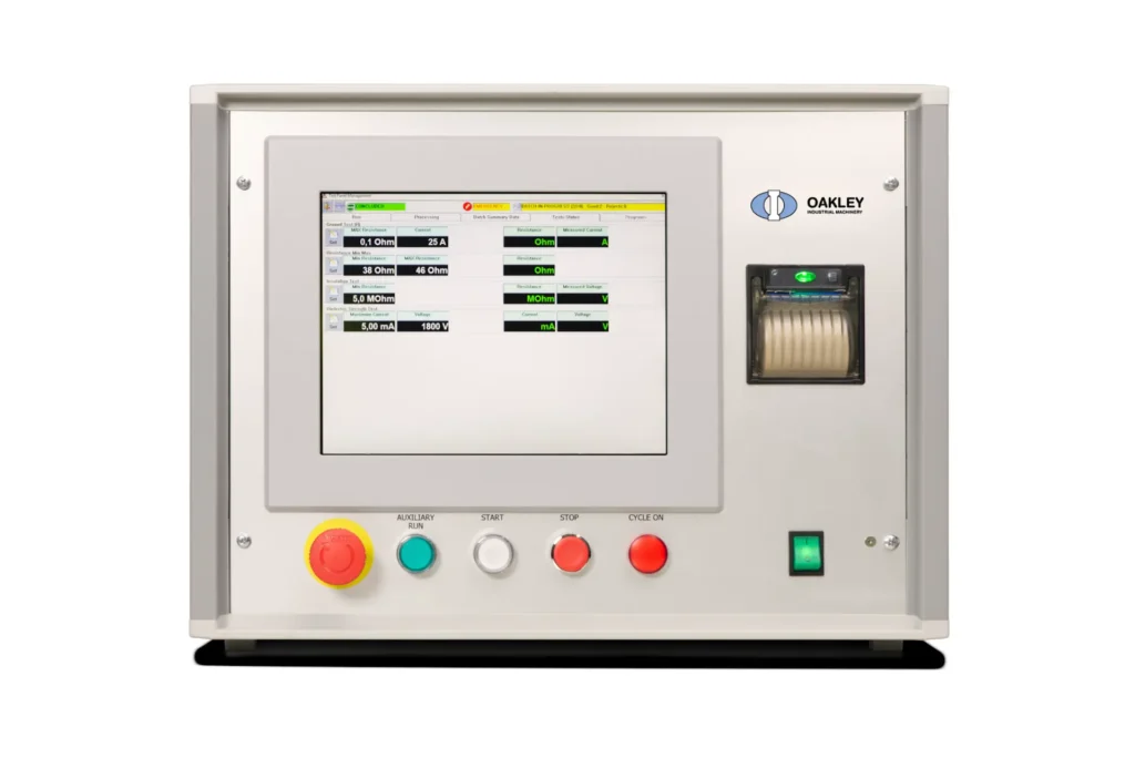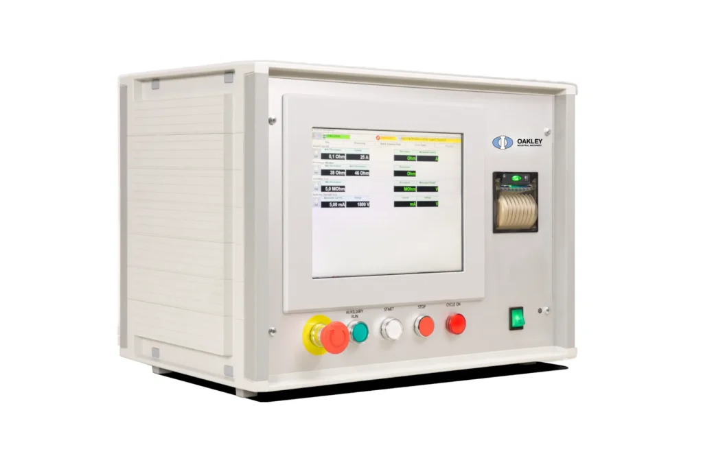 Oakley Industrial Machinery’s multi-test unit provides a complete solution for performing electrical tests for heating elements, integrating electrical, safety, and functional testing in full compliance with CEI EN 60335-1 art. 16-3 and 27-5 standards. The system allows users to preset and program multiple test cycles, while automatically analyzing and storing all measured values.