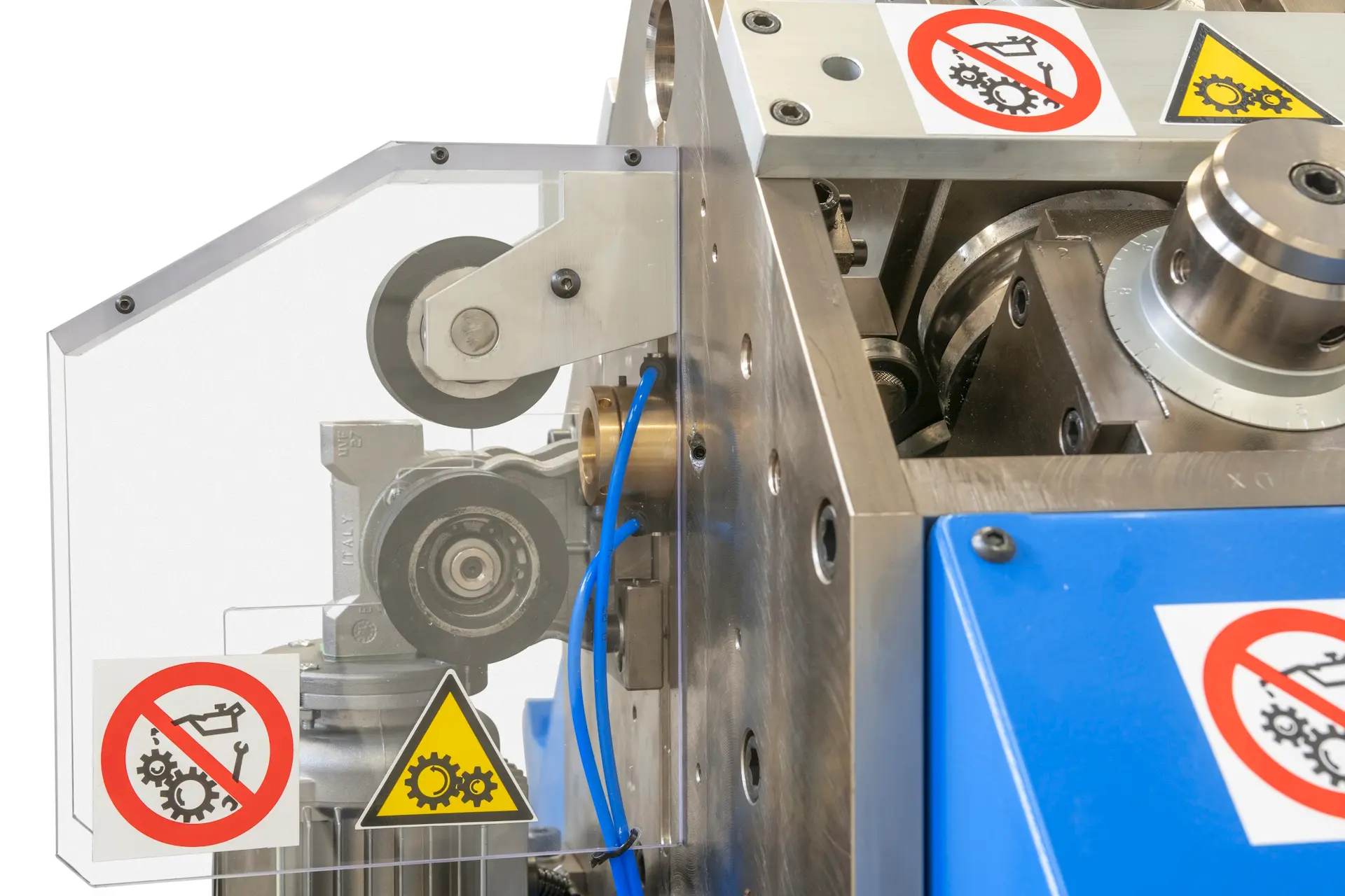 In the rolling mill with a variable roll rotational speed, there is the possibility to program the rotation speed for each pair of rolls through frequency inverters, depending on the elongation of the elements. This solution allows to set the machine for different tube materials. Five sets of program scales of roll speed are available. Each pair of rolls will have a speed corresponding to the elongation of the tube, depending on the tube material. Having control of the speed of each roll station, it is possible to match as closely as possible the elongation occurring. This means that there is less friction between the rolls and tube, and therefore less heat generated by friction. As a result, the rolls last longer and the elements exit straighter.