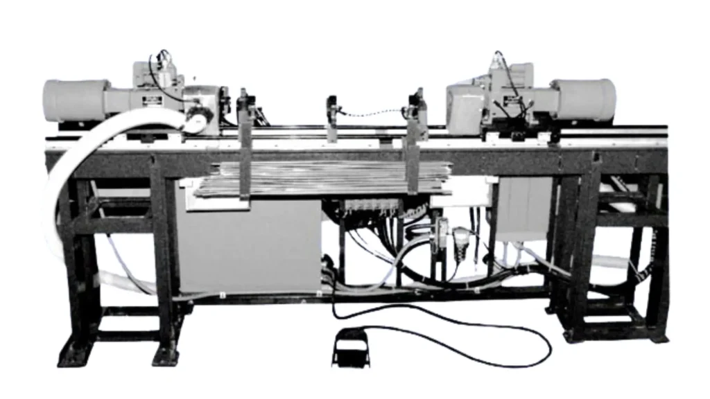 The operator loads the element into guide blocks and pushes it against a disappearing stop. The element is then clamped, the gage disappears, the element is trimmed at both ends, and then it is automatically ejected. This machine can be supplied formaximum element lengths from 600mm to 3650mm (2 to 12 feet) The trim heads are mounted on rails for simple and fast length adjustments. The production rate depends upon the length of the sheath to be trimmed, but should average up to 500 complete elements per hour. On both machines the cutter heads are enclosed and connected to a dust collector to prevent contamination. This enclosure has a quick clamp removal feature. Our special cutter head design makes cutter tool removal and setup exceedingly simple and fast.